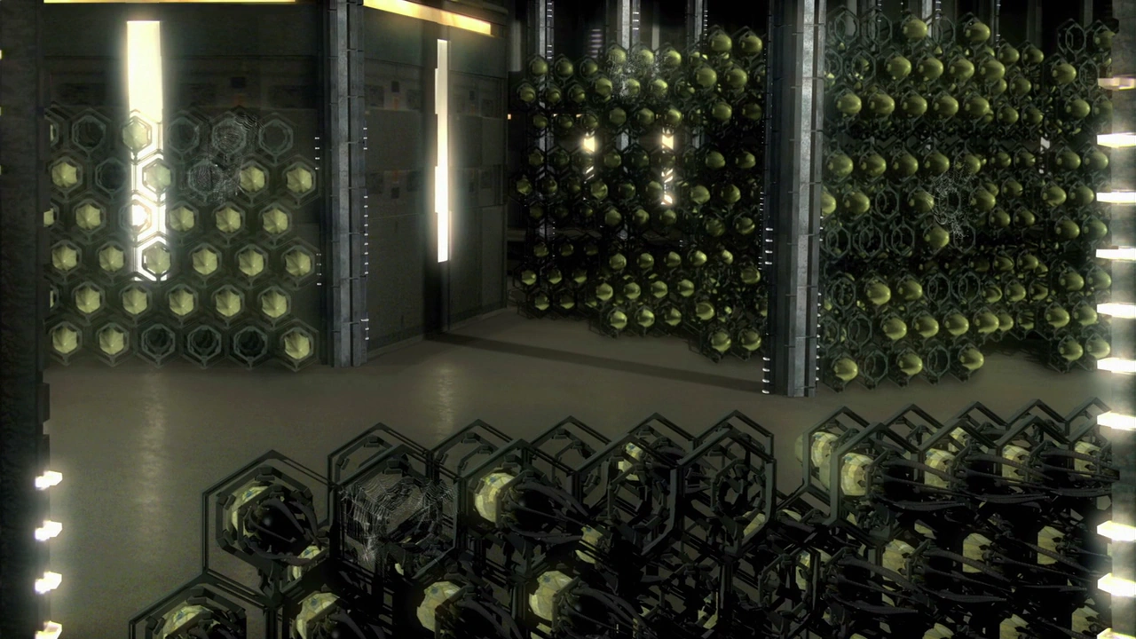 There can be hundreds of drone storage racks present in the chamber but constant use can deplete a City-ship's supply of drones which necessitates replacement weapons in the future.