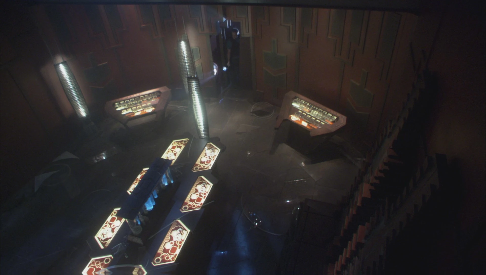 The second, larger, room was used for bigger meetings and contained a ringed table which faced toward the multi-panel doorway. The Lanteans used this room as the base from which their leadership governed their empire. The Asurans similarly used this room as the location wherein their Asuran Council sat during meetings with outsiders.