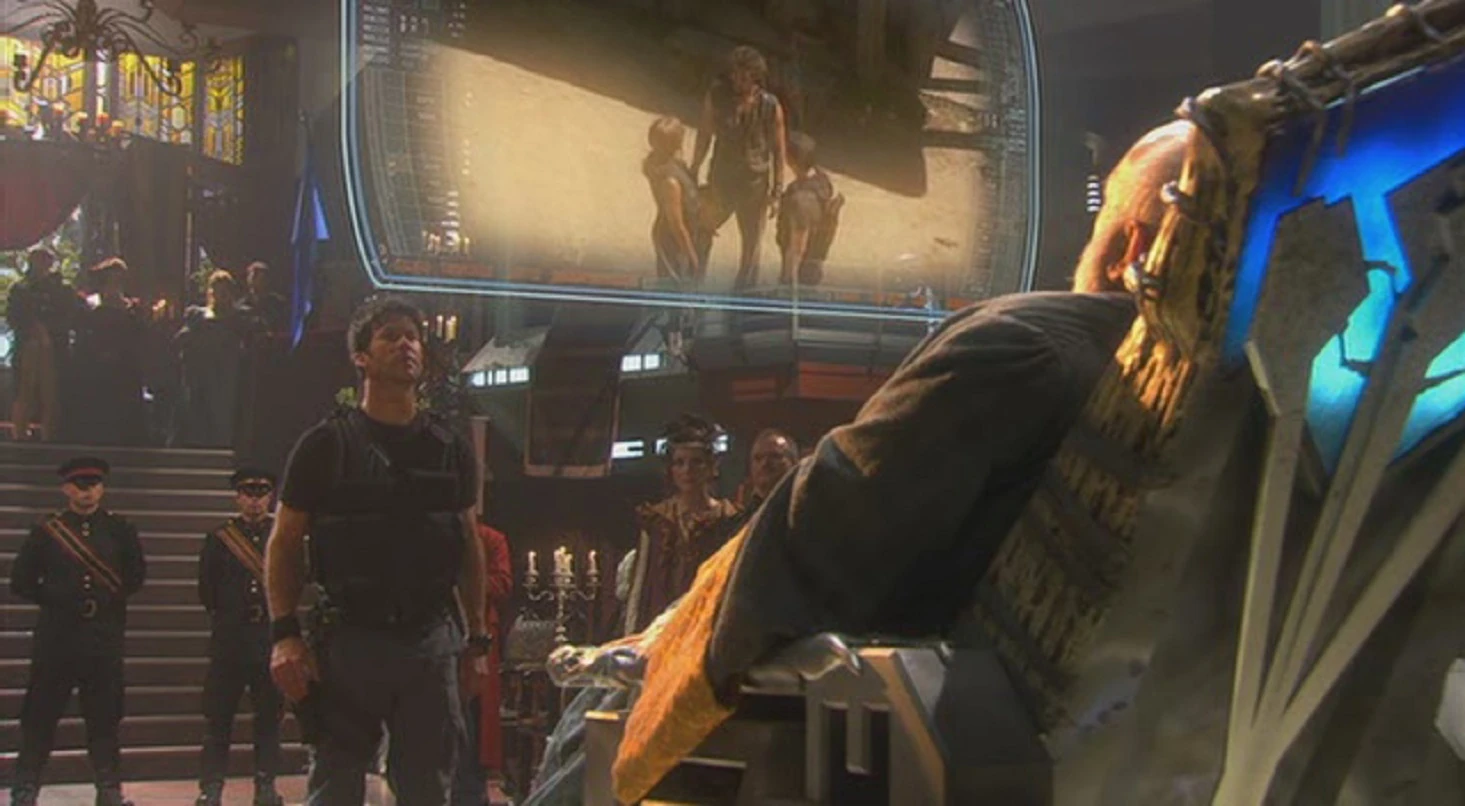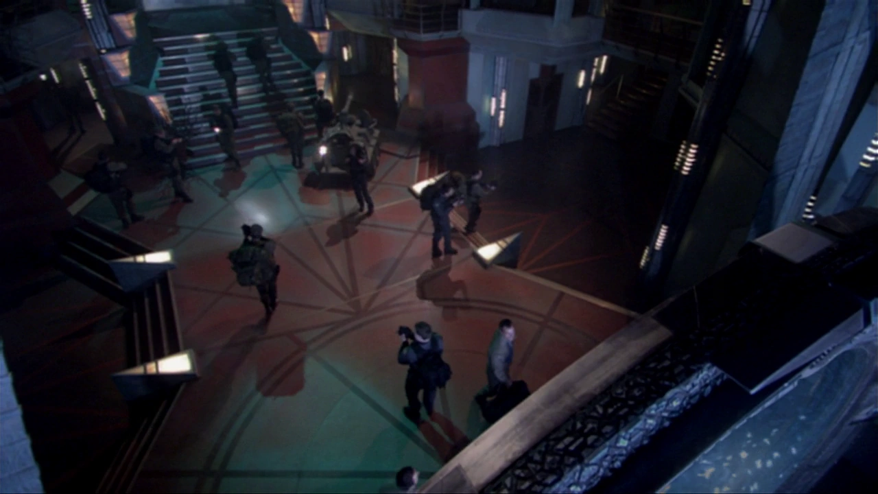 This served as the central point in the City-ship as it served as a connection to the vast galaxy spanning Stargate network. Near the Stargate itself resided the hidden override controls that can be activated by a Lantean giving them control of the City-ship. This chamber inside the city contained a doorway in the ceiling allowing for a Puddle Jumper to drop down and enter the Stargate. The Stargate itself was secured by a force field protecting it thus preventing enemies from entering the city.