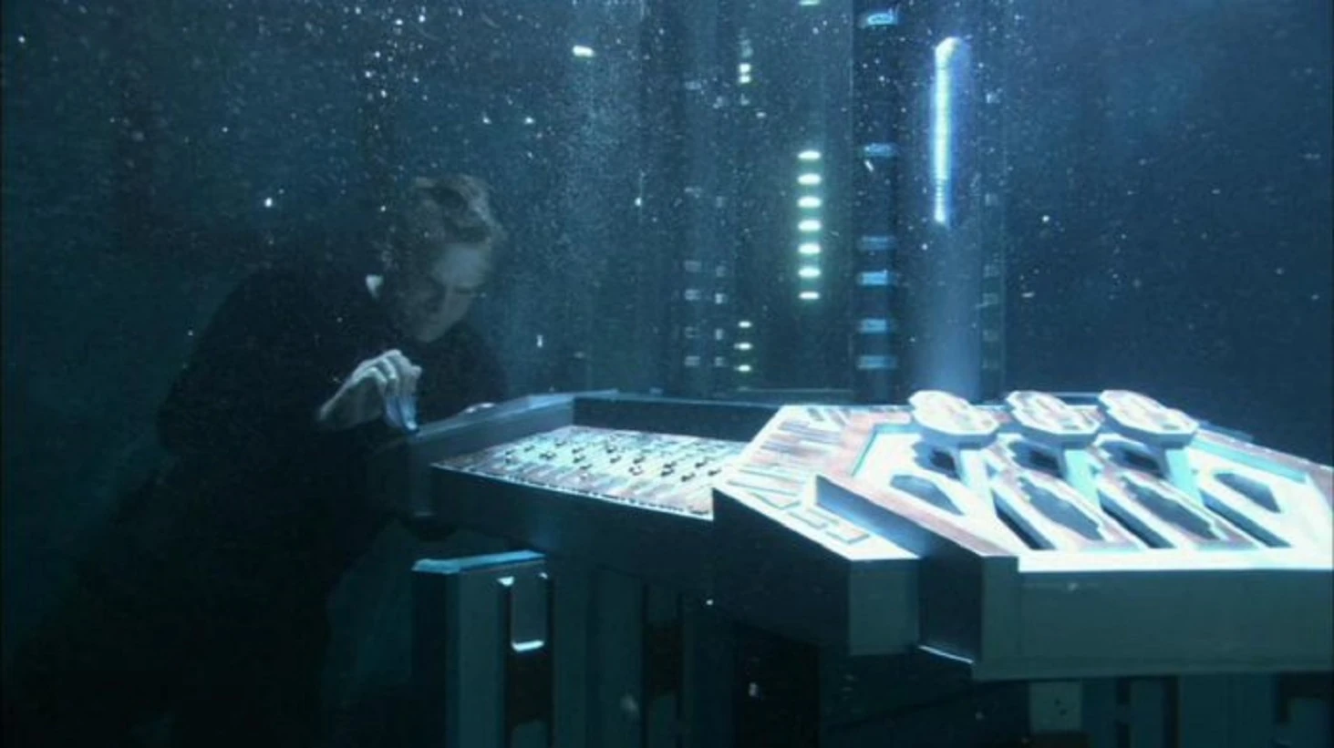 Jack O'Neill in the control room of the underwater Jumper bay, which has been flooded with water