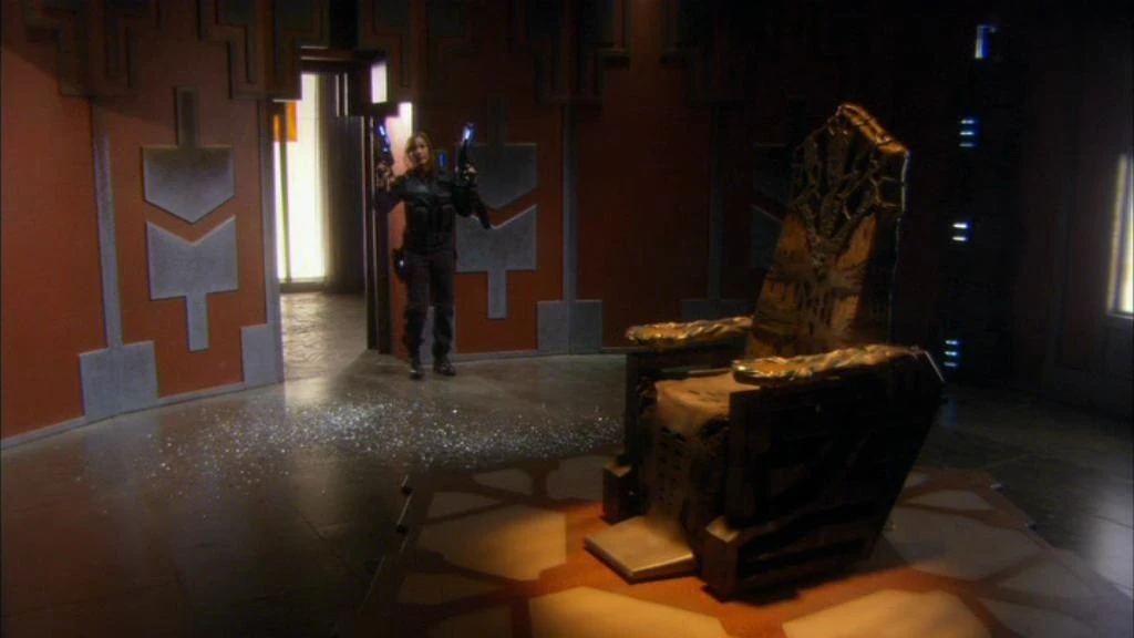 Teyla Emmagan armed with an Anti-Replicator gun in the chair room