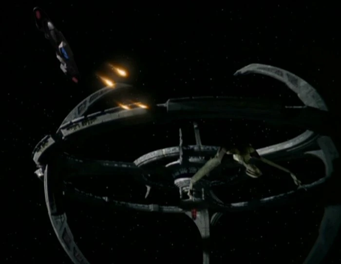 The Defiant makes a strafing run against the Regent's flagship