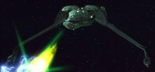A D12-class bird-of-prey firing on the USS Enterprise-D