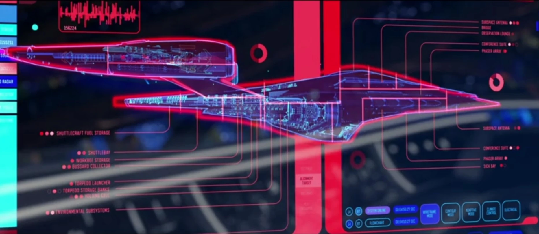 - On the master systems display it is indicated that the shuttlebay is at the rear section of the secondary hull, despite clearly being shown in its forward section. (PRO: "Terror Firma") This is most likely a simple error, as most detailed Starfleet ships of this typical configuration do have their shuttlebays facing to the rear.
