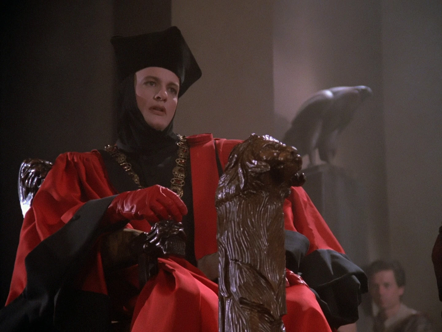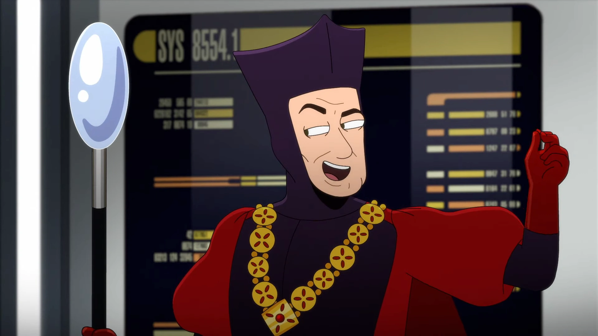 That same year, he made multiple appearances aboard Cerritos. At one point, while wearing a variation of his judge's garb, he abducted four members of the bridge crew to participate in one of his challenges. He dressed the crew up as chess pieces, and put them on a large chessboard, but had anthropomorphic playing cards holding hockey sticks as the opposing pieces, football goal posts at either end of the game board, and a singing, dancing soccer ball.