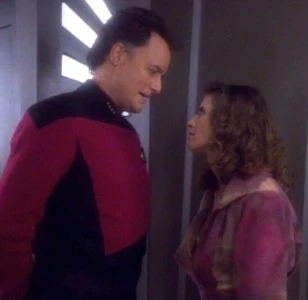 Soon after, Betazoid Ambassador Lwaxana Troi developed romantic feelings toward Q when the two came to the Enterprise during a significant wedding. Q used this to his advantage to perform a cruel experiment on the nature of the human emotion called 'love'.