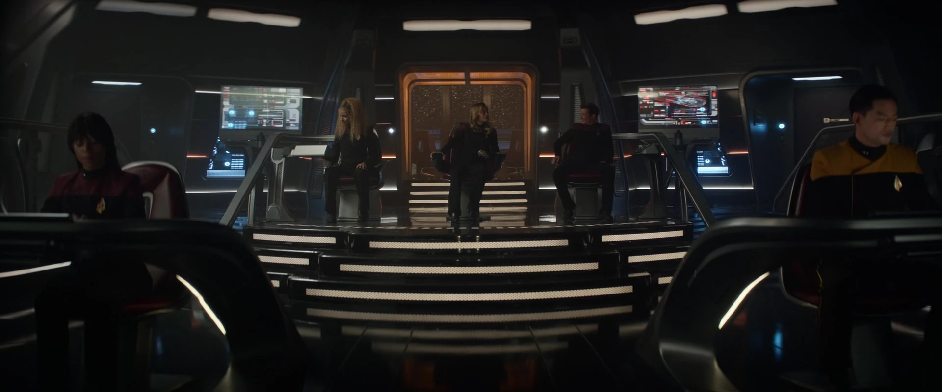 When Vadic and her Changeling crew boarded the Titan-A, Shaw and Seven used the security systems to trap them inside force fields. Unfortunately, the M-5-10's Lore personae gained control long enough to corrupt the ship's systems and free the Changelings, who then seized the bridge. Vadic sat in the command chair and declared herself "captain of the USS Titan" while demanding Jack Crusher's surrender. (PIC episode: "Dominion")