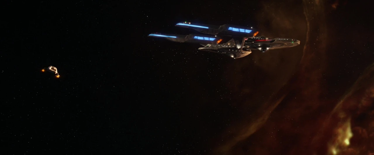 Shuttle Saavik departing the Titan-A after being commandeered by Admiral Picard and Captain Riker